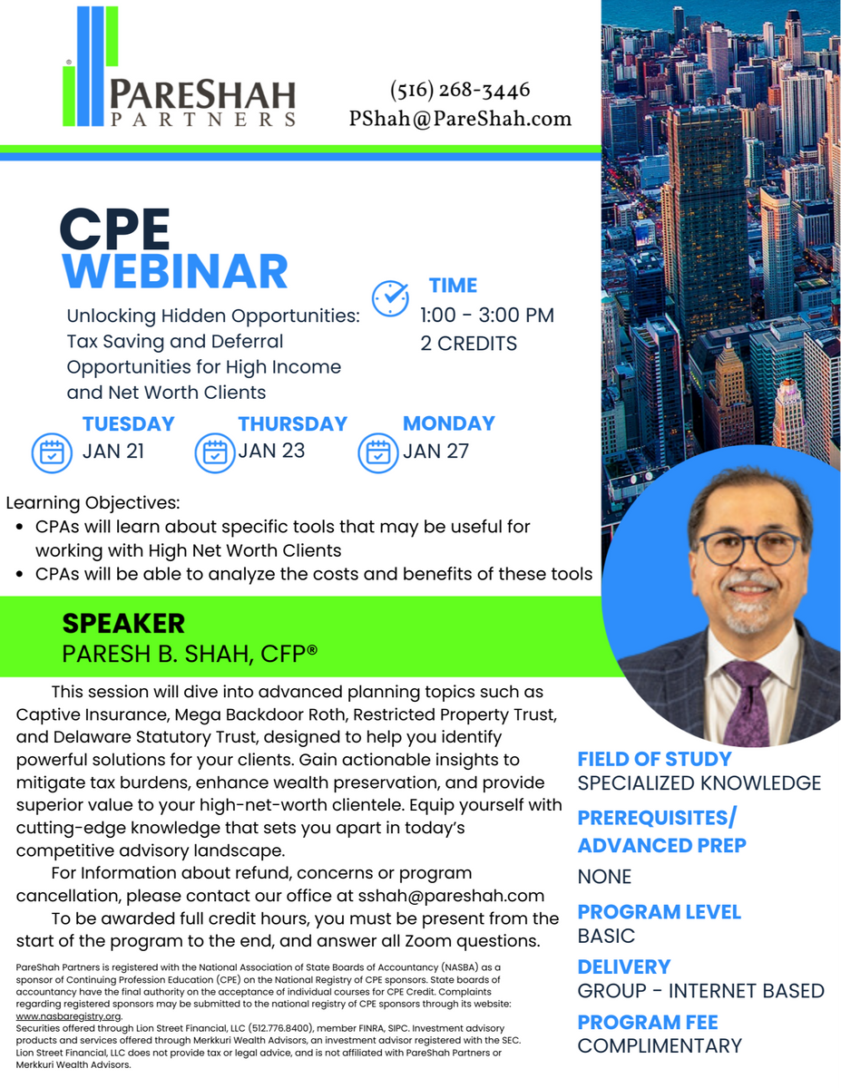 Discover innovative strategies to elevate your tax planning expertise at our Continuing Education presentation, "Unlocking Hidden Opportunities: Tax Saving and Deferral Opportunities for High-Income and High-Net-Worth Clients." This session will dive into advanced planning topics such as Captive Insurance, Mega Backdoor Roth, Restricted Property Trust, and Delaware Statutory Trust, designed to help you identify powerful solutions for your clients. Gain actionable insights to mitigate tax burdens, enhance wealth preservation, and provide superior value to your high-net-worth clientele. Equip yourself with cutting-edge knowledge that sets you apart in today’s competitive advisory landscape. Don’t miss this opportunity to uncover hidden opportunities and sharpen your professional edge!