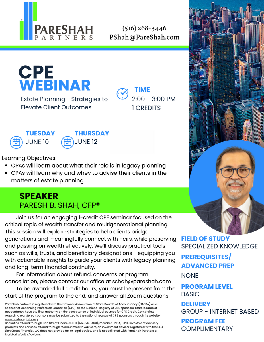 Join us for an engaging 1-credit CPE seminar focused on the critical topic of wealth transfer and multigenerational planning. This session will explore strategies to help clients bridge generations and meaningfully connect with heirs, while preserving and passing on wealth effectively. We’ll discuss practical tools such as wills, trusts, and beneficiary designations - equipping you with actionable insights to guide your clients with legacy planning and long-term financial continuity.